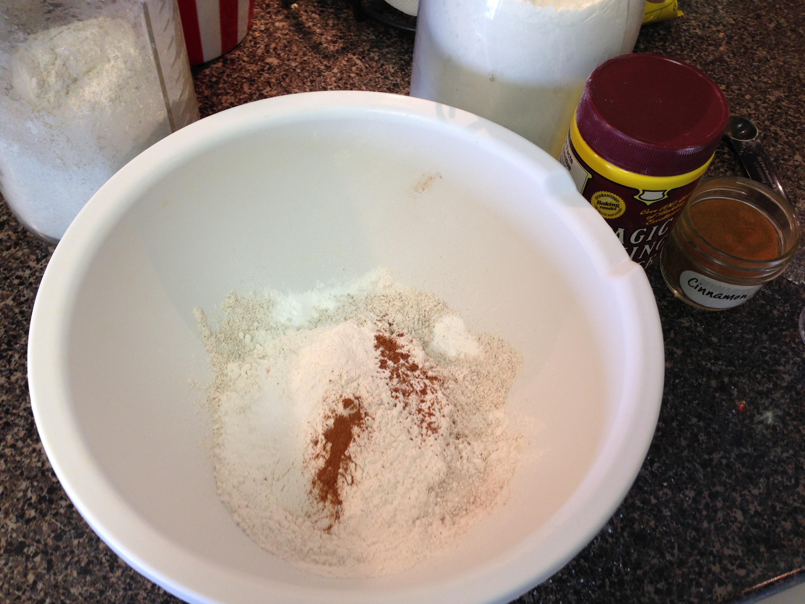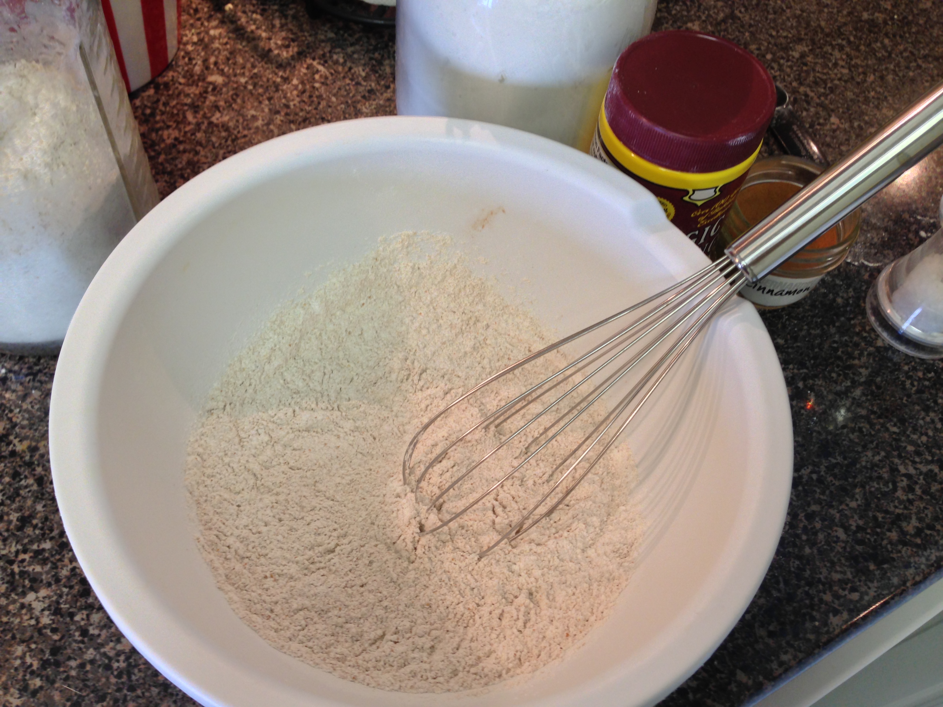 In a medium-sized bowl, mix both flours, baking powder, nutmeg, cinnamon, and salt together. Set aside.