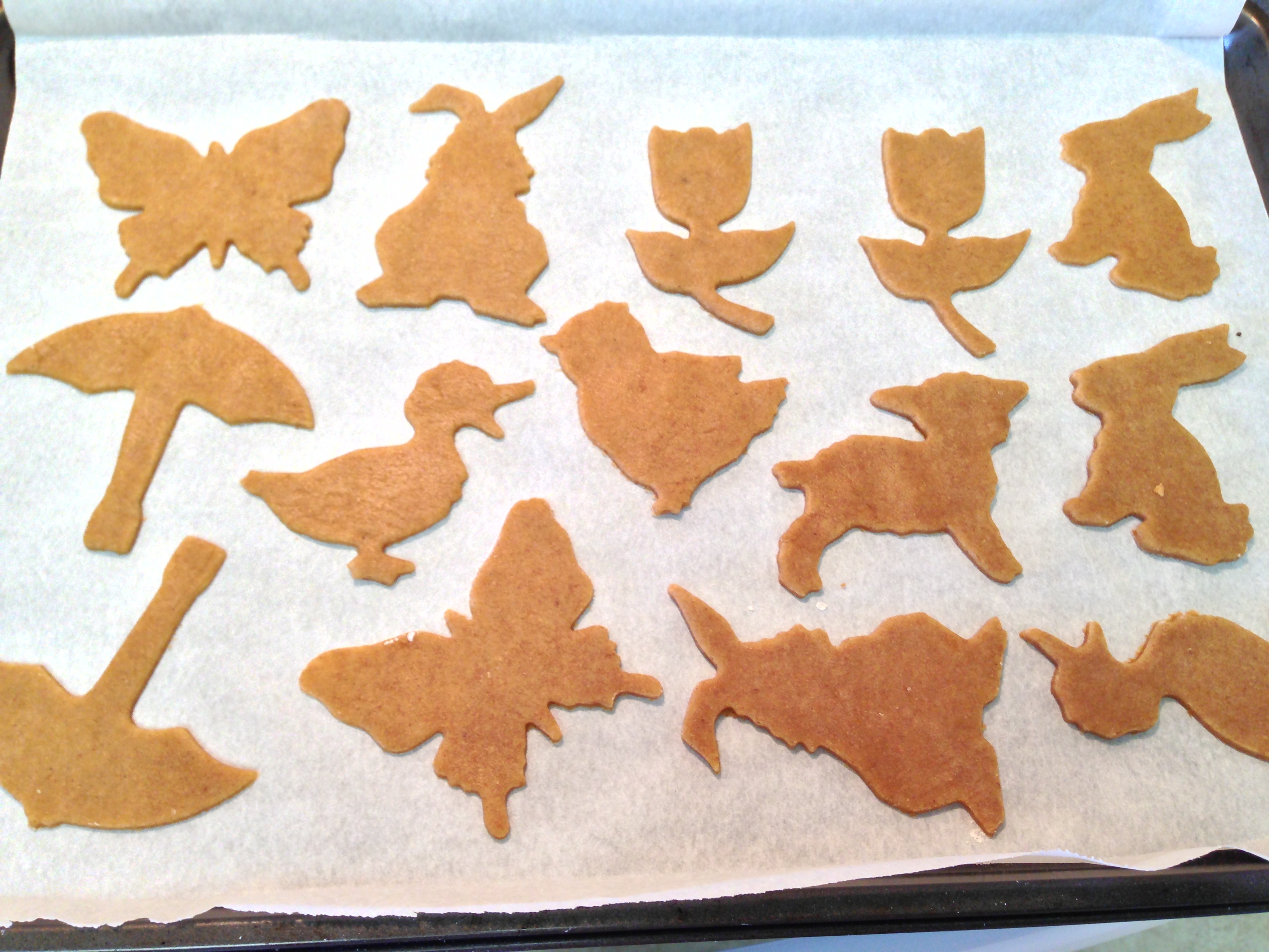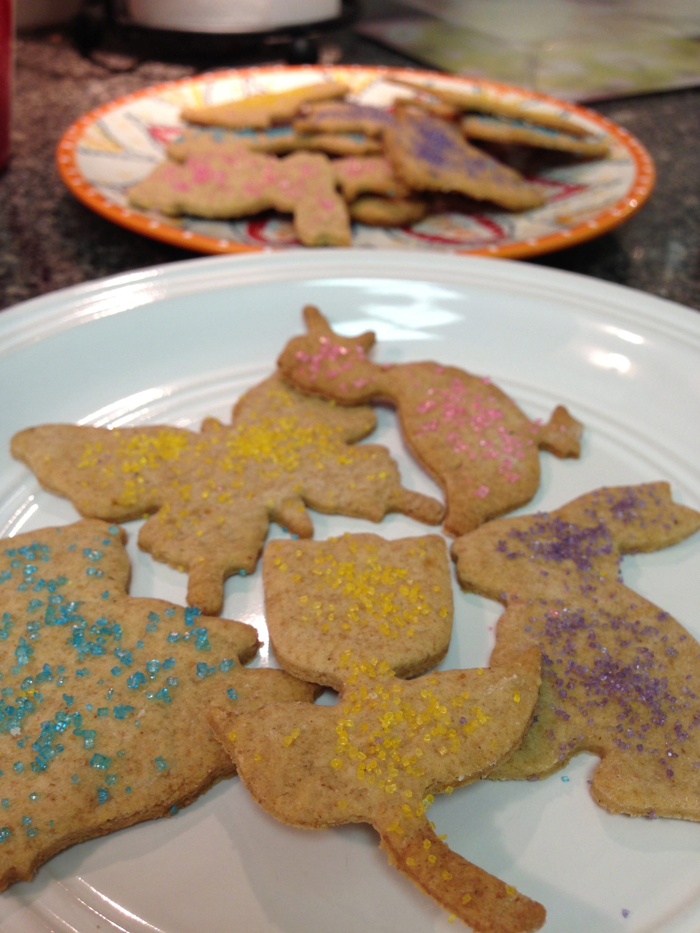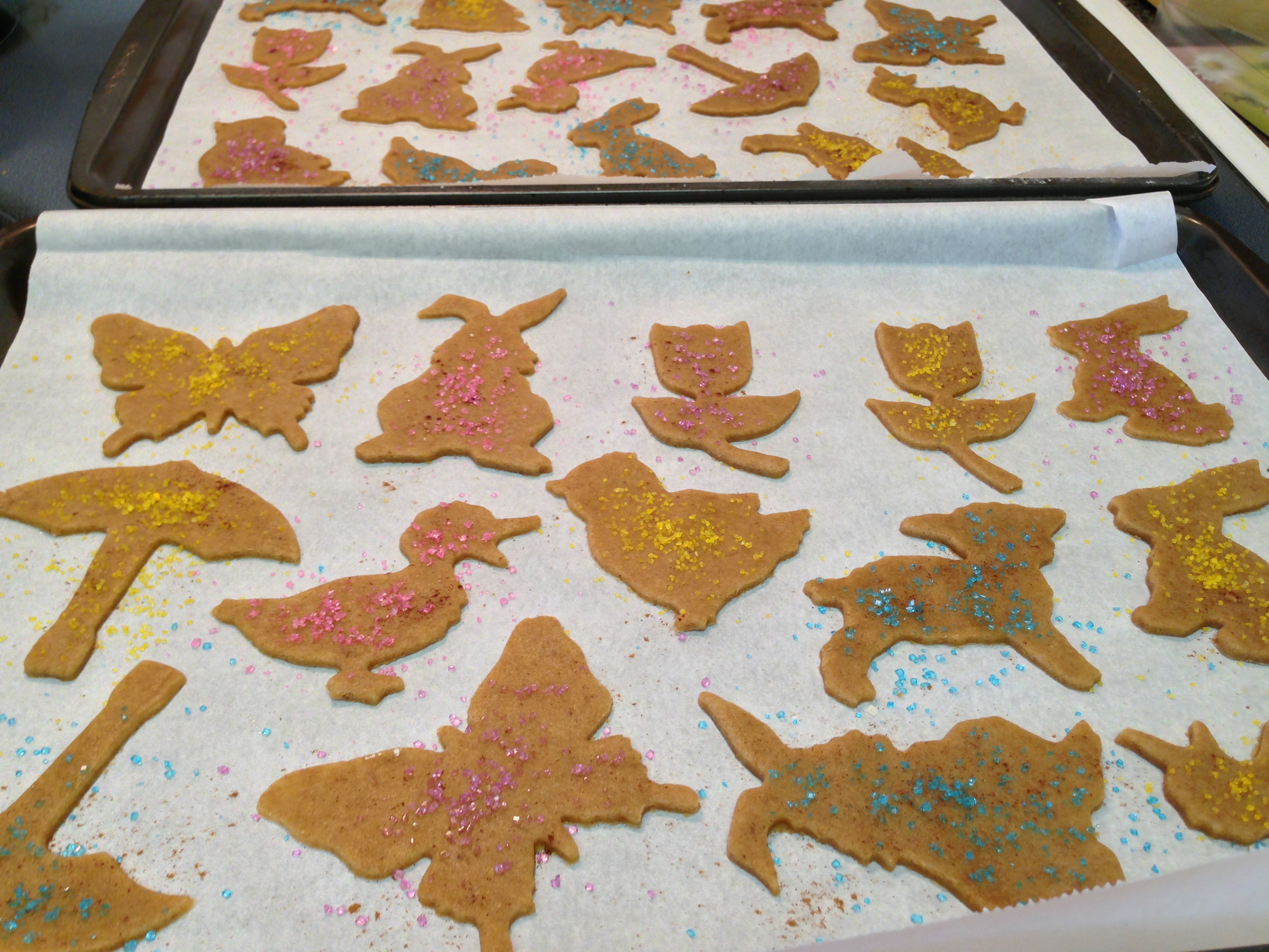 Birthday party tonight. Springtime is coming. I want to bake. Those are enough reasons to dig out the cute springtime cookie cutters I bought last spring, that were never used, and bake some cookies! I didn’t have a lot of time, so I wanted a simple recipe. Sugar cookies are really easy to make and don’t require many ingredients. Looking up some recipes, I noticed that classic sugar cookies are not particularly health-friendly. They’re mostly made of flour, lots of butter, and lots of sugar. I decided to try doing a version that’s a bit healthier. I switched most of the flour for whole wheat flour and didn’t use as much butter. I used 3 tablespoons of butter, as opposed to the 1 cup of butter in most recipes. I also used brown sugar, and less of it. I browned the butter and added a bit of spice to the cookies, which I think also cut some of the sweetness. I passed on the colourful, sugar-loaded (but so pretty) royal icing and opted to do just a light sprinkle of sanding sugar over top. I still got the springtime pastel colours I wanted!